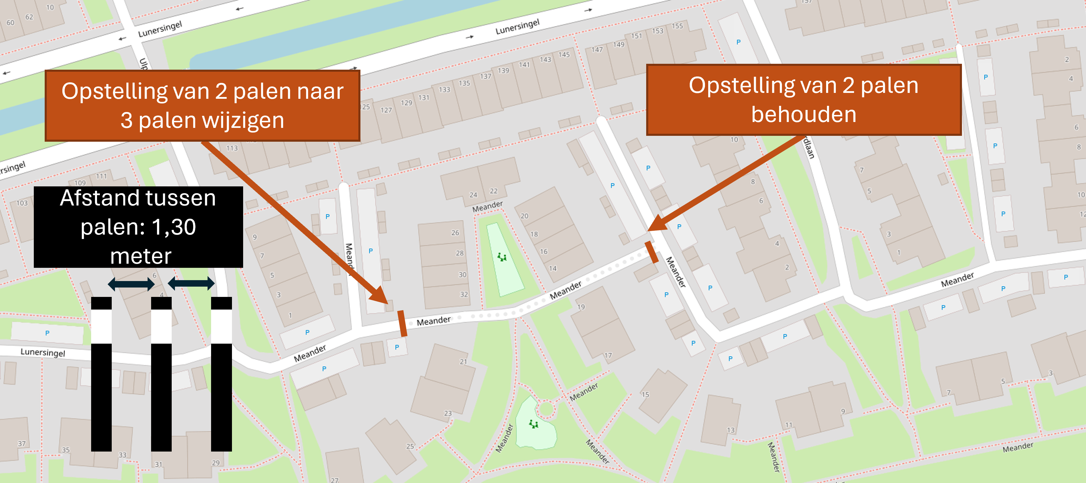 Als bijkomende maatregel van dit verkeersbesluit wordt aan de westzijde van het gebied een extra paaltje toegepast. Op deze manier wordt de doorgang versmald. Aan de oostzijde blijft dit een opstelling van 2 palen, zie de bijlage voor de uitwerking.