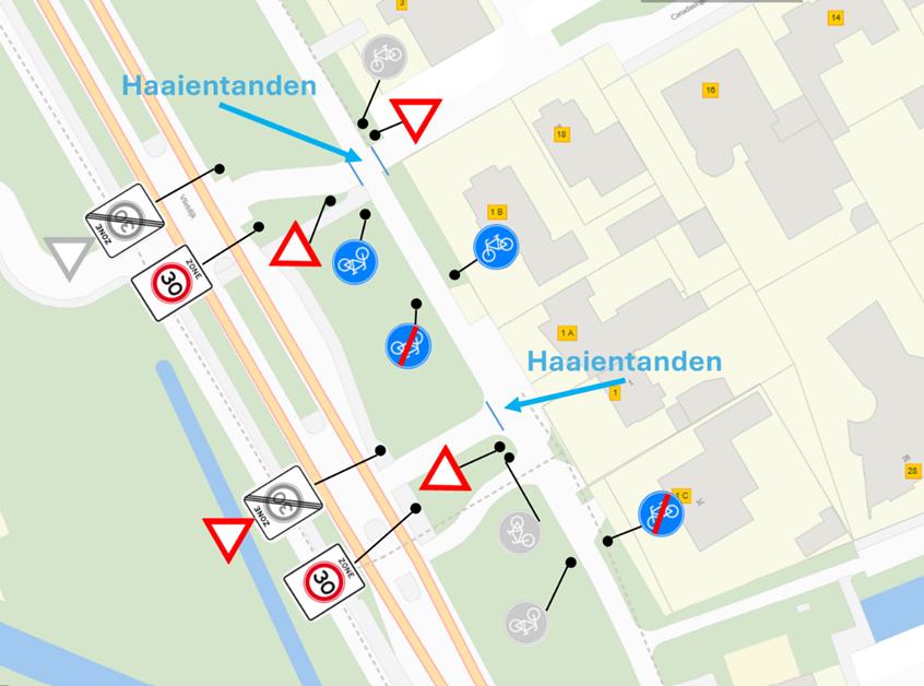 Parallel aan de Vlietdijk loopt een fietspad dat tussen perceel 1C en de kruising Vlietdijk/ Canadasingel overgaat in een ventweg met de wegcategorisering ‘erftoegangsweg’. In de huidige situatie ontbreekt een zone‑30‑aanduiding voor dit deel van de ventweg. Vanuit het oogpunt van verkeersveiligheid heeft de gemeente ’s‑Hertogenbosch besloten het bestaande zone‑30‑bord aan de Canadasingel te verplaatsen naar de uitrit aan de Vlietdijk. Daarnaast wordt eenzelfde bord geplaatst bij de uitrit tegenover de percelen 1 en 1A, ten behoeve van de ontsluiting van deze percelen. De A01‑30‑ZB‑borden worden aangevuld met A02‑30‑ZE‑borden om het einde van de zone te markeren.