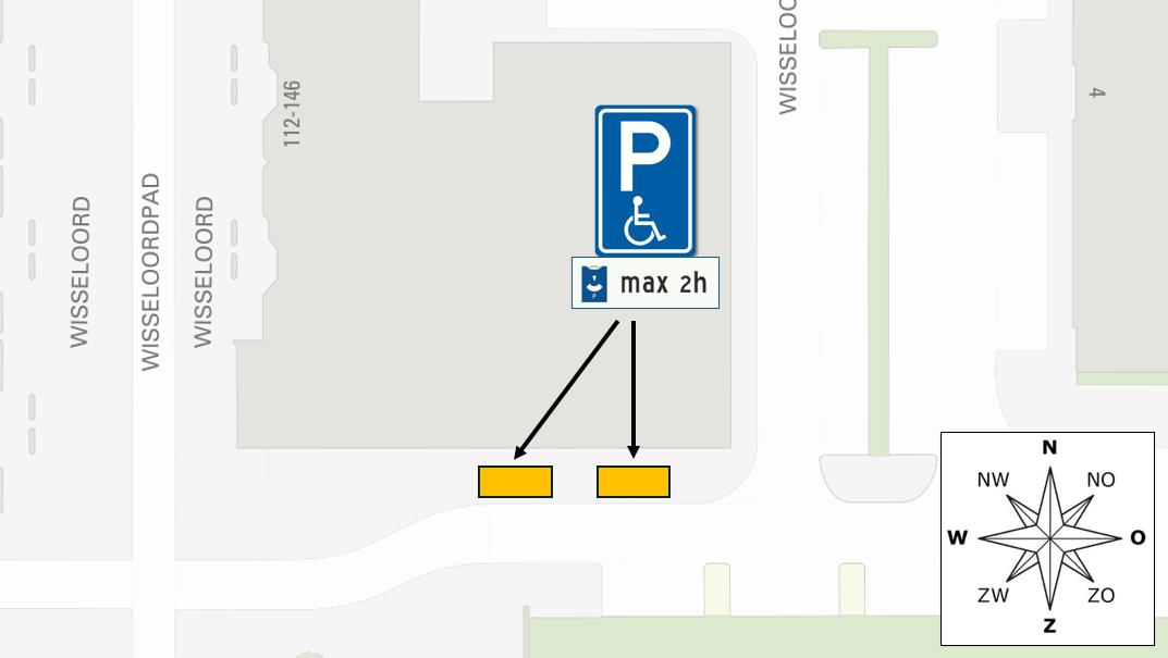 Door het plaatsen van verkeersborden conform model E6 van Bijlage I van het RVV 1990, voorzien van een onderbord met de tekst ’max 2h’ (+symbool parkeerschijf), aan te wijzen: twee algemene gehandicaptenparkeerplaatsen met een maximale parkeerduur van 2 uur, aan de zuidzijde van het Wisseloordplein ter hoogte van de zijgevel van de op Wisseloord gelegen supermarkt (parkeervaknummers nog niet bekend).
