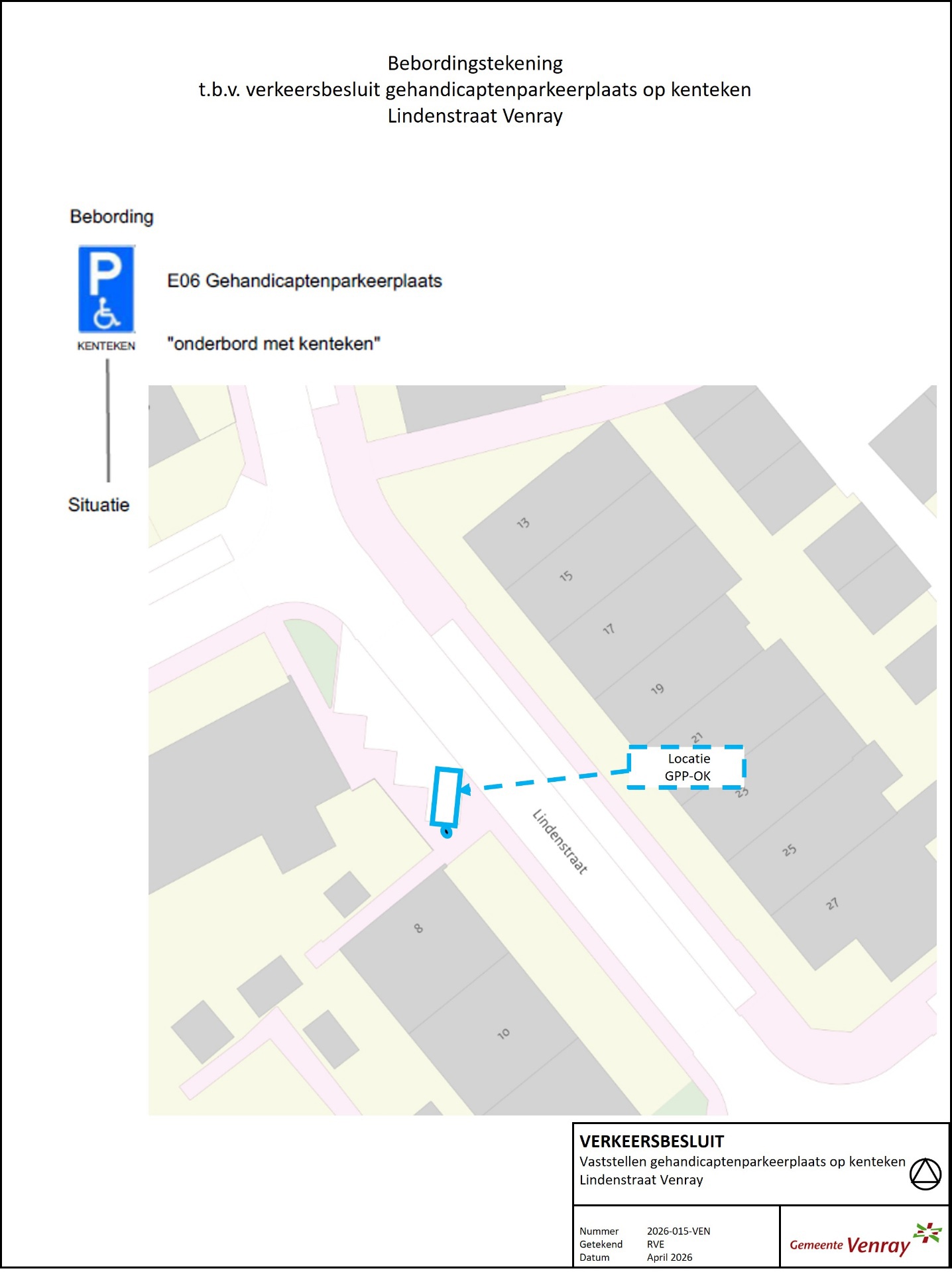 Verkeersbesluit – Vaststellen gehandicaptenparkeerplaats op kenteken – Lindenstraat - Venray