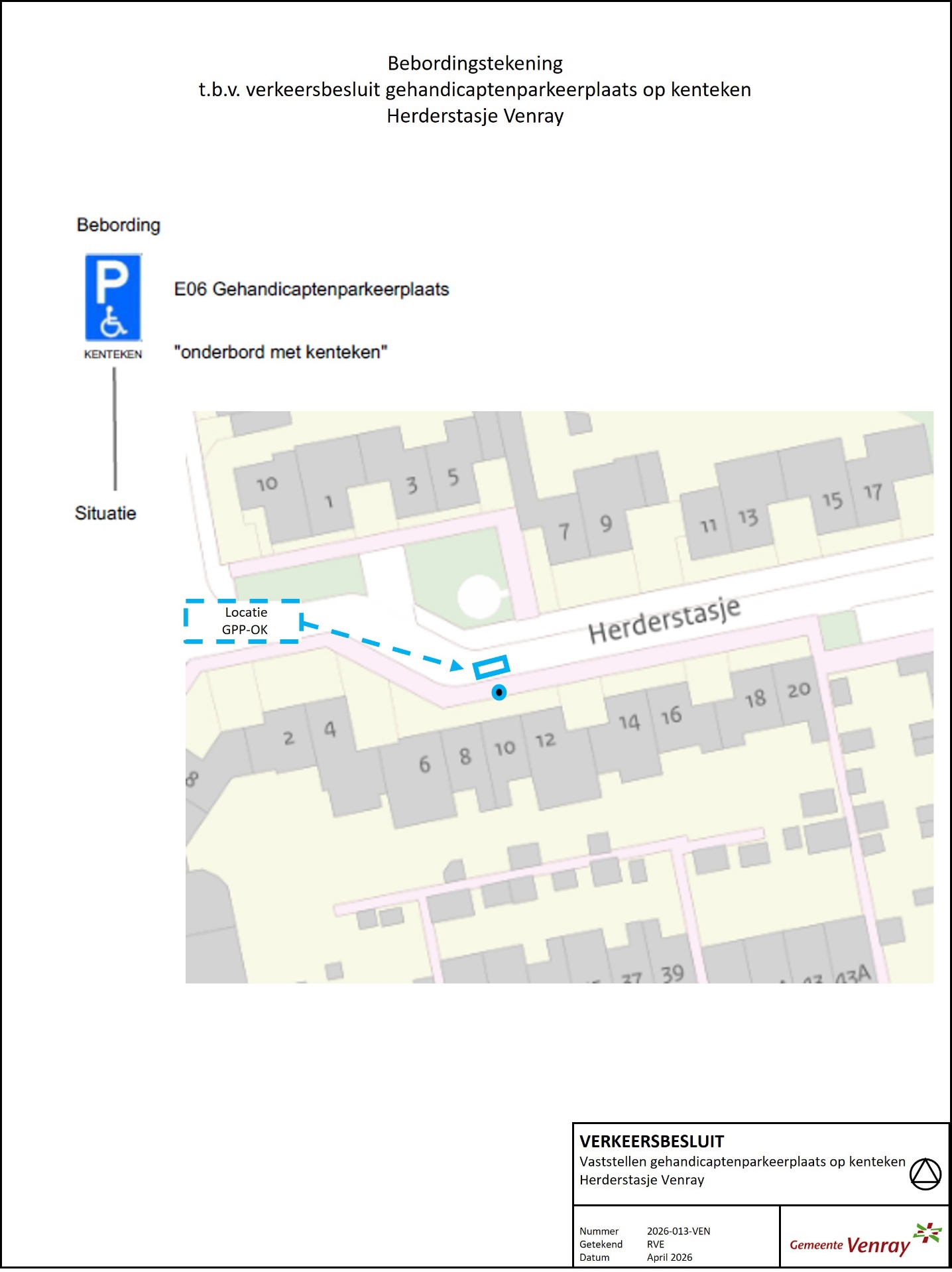 Uit het oogpunt van het waarborgen van de bruikbaarheid van de weg is het gewenst in het Herderstasje te Venray een gehandicaptenparkeerplaats op kenteken aan te leggen voor een bewoner van het Herderstasje.