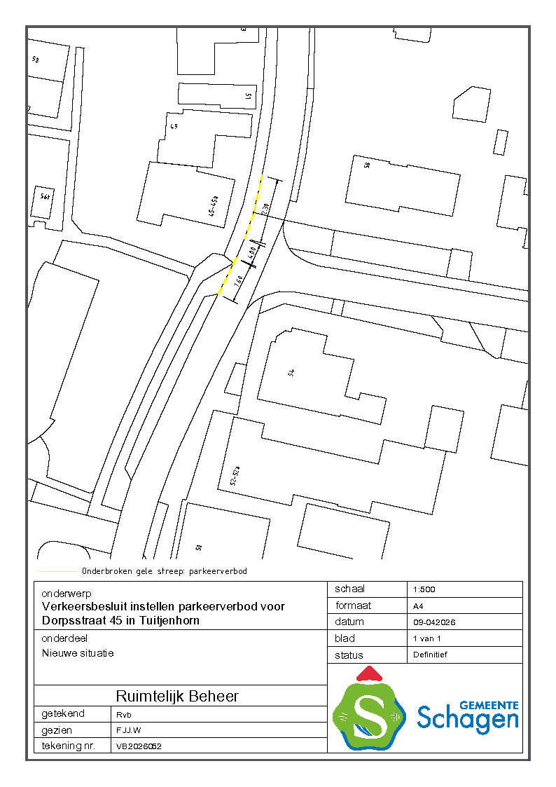 Gemeente Schagen- Verkeersbesluit instellen parkeerverbod (ged.) nabij Dorpsstraat 45, Tuitjenhorn.