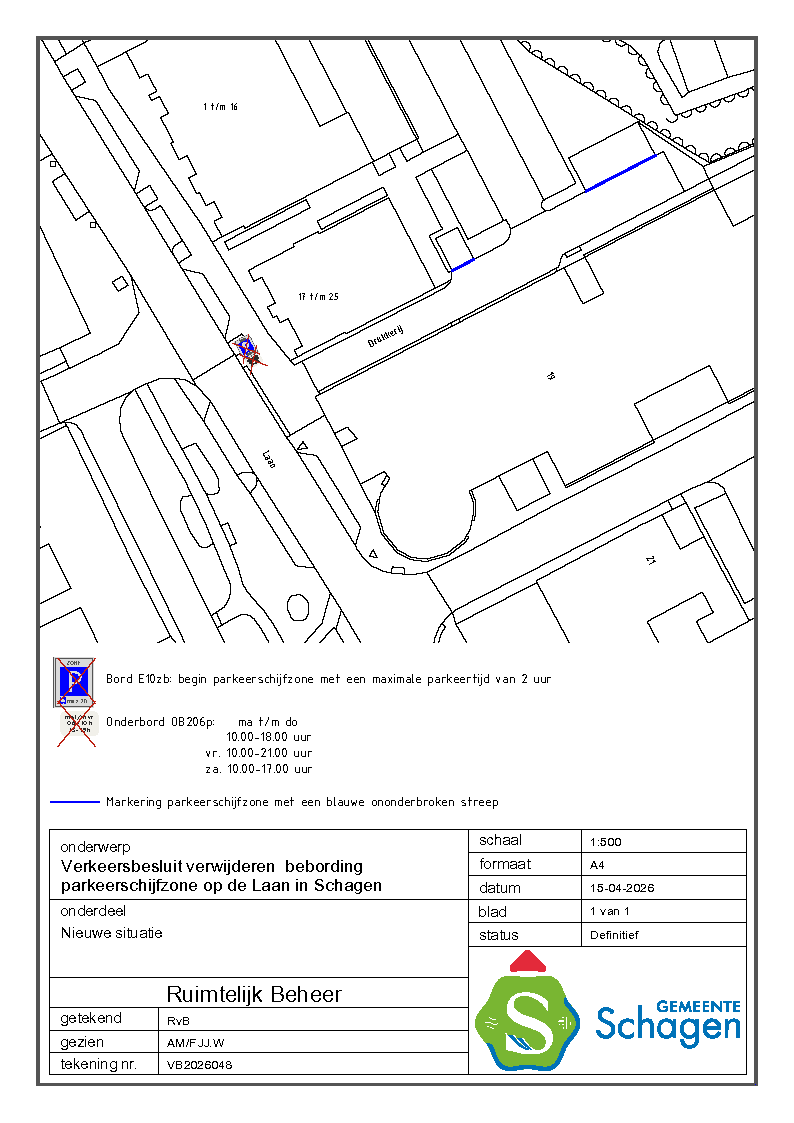 Gemeente Schagen- Verkeersbesluit uitbreiding blauwe zone op de Drukkerij, Schagen.