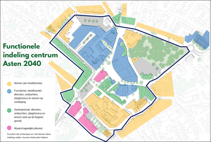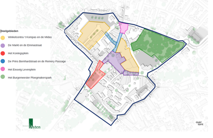 Onderstaande gebieden vormen samen het fundament voor de verdere uitbouw van het centrum als levendig hart van Asten.