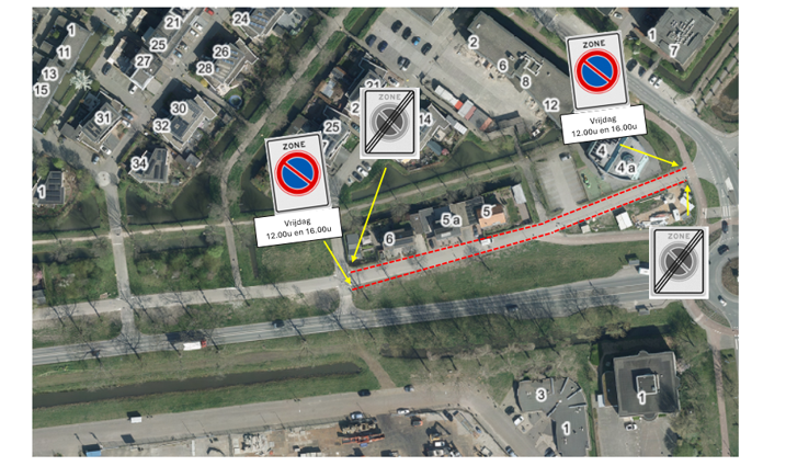 De stippellijn geeft de locatie van de parkeerverbod zone op vrijdag tussen 12.00 uur en 16.00uur aan. De parkeerverbod zone wordt aangeduid met verkeersbord E01zb en OB203p met de tijden waarop het parkeerverbod van kracht is. Het einde van het parkeerverbod wordt aangeduid met verkeersbord E01ez.
