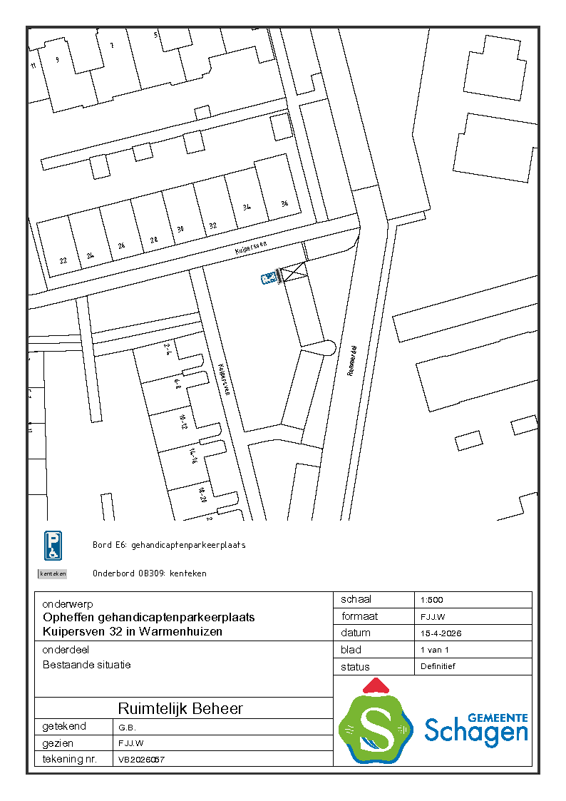 Gemeente Schagen- Verkeersbesluit opheffen gehandicaptenparkeerplaats nabij Kuipersven 32, Warmenhuizen.