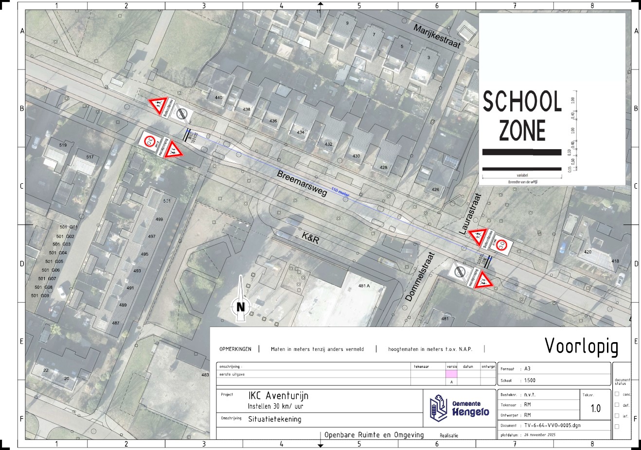 Aan de Breemarsweg is IKC Aventurijn gevestigd. Dagelijks rijden circa 4.000 motorvoertuigen langs deze locatie, waar momenteel een maximumsnelheid van 50 km/uur geldt. Een schoolomgeving vraagt echter om extra aandacht voor verkeersveiligheid. In de CROW-notitie over schoolzones staat dat een schoolzone thuishoort op een weg met een maximumsnelheid van 30 km/uur. De huidige situatie voldoet dus niet aan deze richtlijn. Daarom verlaagt de gemeente de snelheid op het wegvak direct voor de school naar 30 km/uur. Daarnaast worden verkeersborden geplaatst die wijzen op de schoolzone, zodat weggebruikers extra alert zijn. Ook wordt op het asfalt markering aangebracht met de tekst ‘schoolzone’.