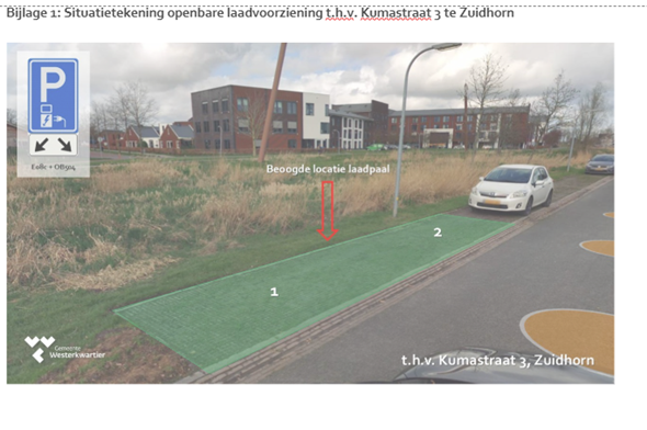 Een parkeerplaats in te richten t.b.v. het opladen van elektrische voertuigen op de locatie t.h.v. Kumastraat 3 te Zuidhorn, zoals aangegeven op bijgaande situatietekening, zodanig dat twee auto’s opgeladen kunnen worden;
