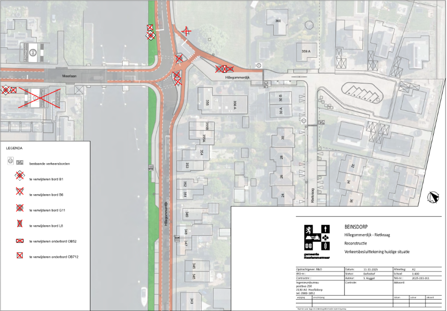 Het intrekken van de huidige afgebogen voorrangsregeling door het verwijderen van borden conform model B1 (inclusief onderborden OB712) en B6 uit bijlage I van het Reglement Verkeersregels en Verkeerstekens (RVV) 1990 en haaientanden conform artikel 80 RVV 1990 rondom het kruispunt Hillegommerdijk – Meerlaan in Beinsdorp;