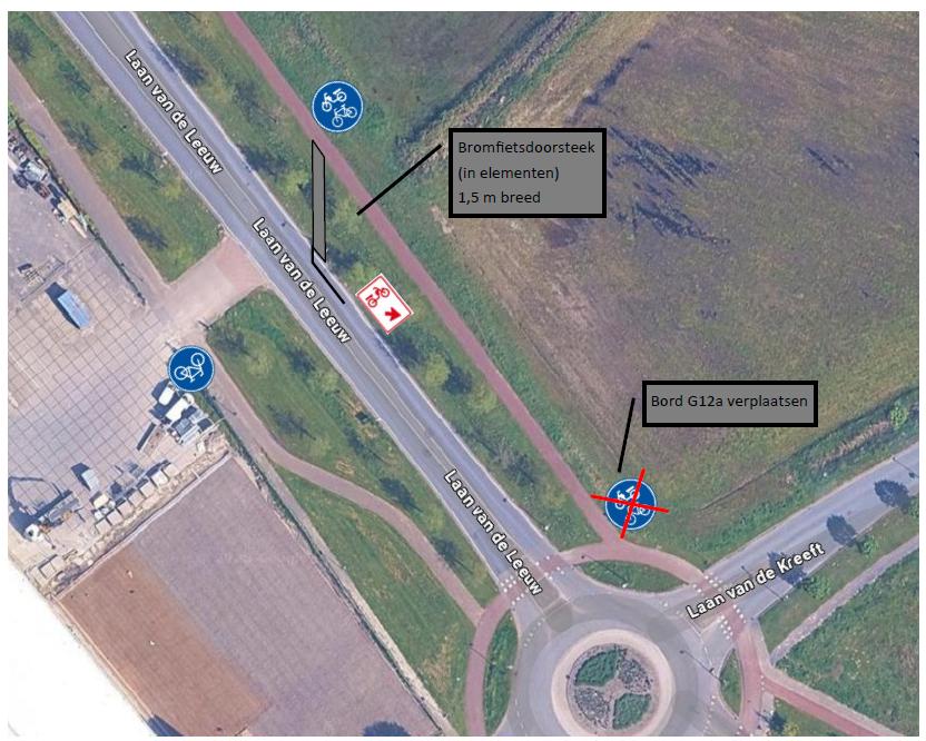 In de huidige situatie is langs de Laan van de Leeuw een bromfietspad is gelegen. De aansluiting is niet logisch en consequent uitgevoerd, waardoor bromfietsers op de rotonde ook van het fietspad gebruik moeten maken. Een onwenselijke en onveilige situatie gelet op de hogere snelheden. Dit is aanleiding om een extra bromfietsdoorsteek te maken tussen hoofdrijbaan en naastgelegen fietspad. De bromfiets kan dan op een veilige en logische plek (vlak bij de bebouwde komgrens) de rijbaan verlaten.
