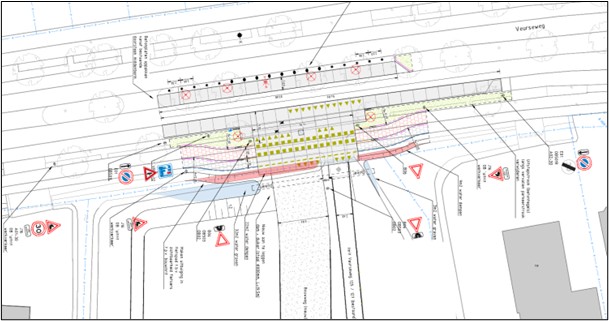 - dit onder andere betekent dat de middenberm wordt versmald maar niet volledig overrijdbaar wordt gemaakt en de aan de zijde van de bouwweg gelegen parkeerstrook deels wordt opgeheven zodat grote voertuigen voldoende manoeuvreerruimte hebben zonder schade toe te brengen aan geparkeerde voertuigen of de openbare ruimte en met voldoende zicht op verkeer dat zich bevindt op het naastgelegen verplicht fietspad en trottoir;