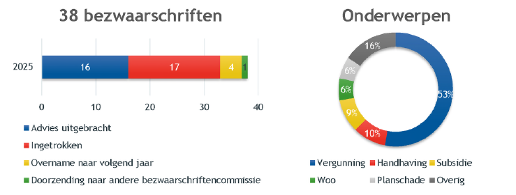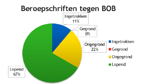 Er zijn 5 lopende beroepen uit 2024 overgenomen. Van de in totaal 9 beroepen is 1 beroepschrift ingetrokken (vanwege een minnelijke oplossing) en zijn 2 beroepen ongegrond verklaard (BOB conform advies). Tijdens de jaarwisseling naar 2026 zijn 6 beroepzaken lopend.