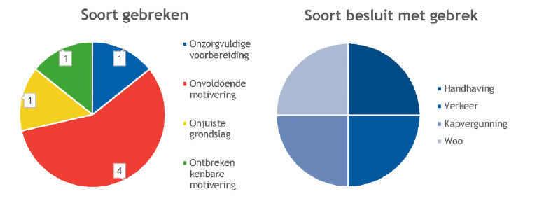 De gebreken die de commissie bij 6 besluiten heeft geconstateerd, betreffen 1 keer een onzorgvuldige voorbereiding, 4 keer een niet toereikende motivering, 1 keer een onjuiste grondslag van het besluit en 1 keer het ontbreken van een kenbare motivering. In 1 van de 6 gevallen was sprake van 2 soorten gebreken.