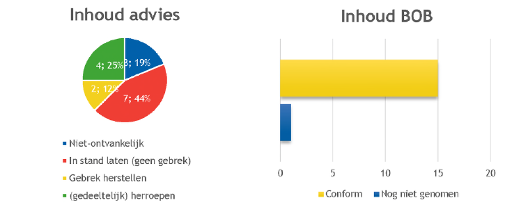 Uit de cijfers blijkt dat het bestuursorgaan steeds het advies van de commissie heeft gevolgd. Het bestuursorgaan kan gemotiveerd afwijken van het advies van de commissie (contrair gaan). De commissie wordt in de regel bij een contraire beslissing op bezwaar door het verwerend bestuursorgaan op de hoogte gebracht van dit feit.