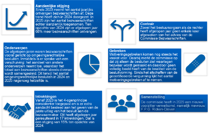 De afgelopen jaren waren bezwaarschriften vooral gericht op omgevingsrechtelijke besluiten. Inmiddels is er sprake van een verschuiving: het aandeel van andere onderwerpen neemt toe, waardoor het totaal aan bezwaarschriften steeds diverser wordt samengesteld. Dit terwijl het aantal omgevingsrechtelijke besluiten in 2024 en 2025 nagenoeg hetzelfde is.