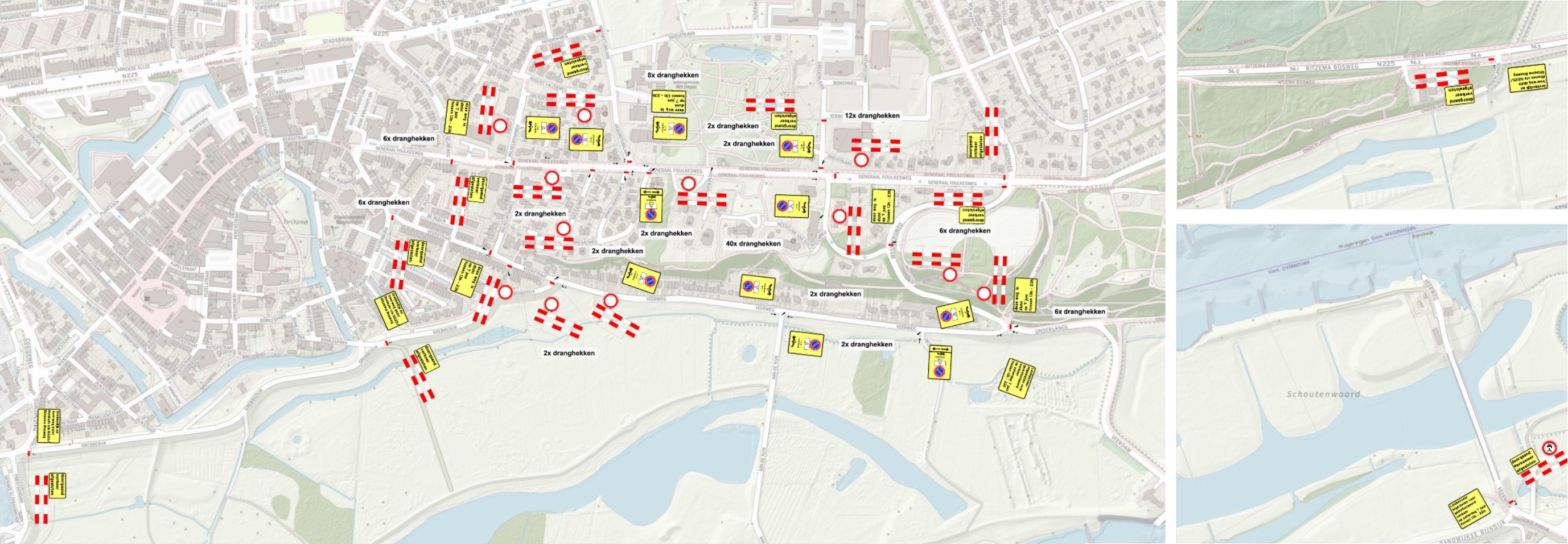 In de afbeelding hierboven is te zien welke borden er geplaatst worden, welke wegen afgesloten worden voor het verkeer en waar parkeerverboden gaan gelden.