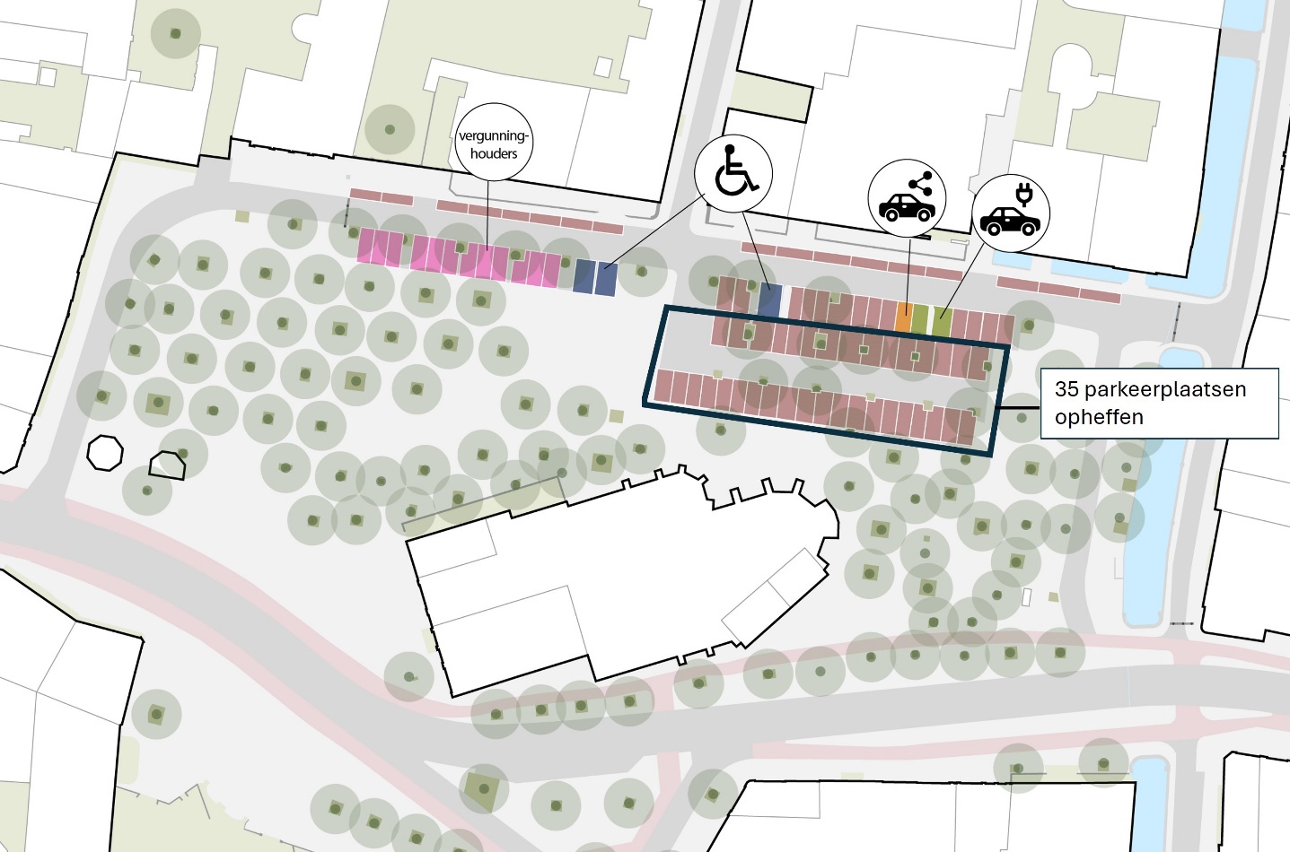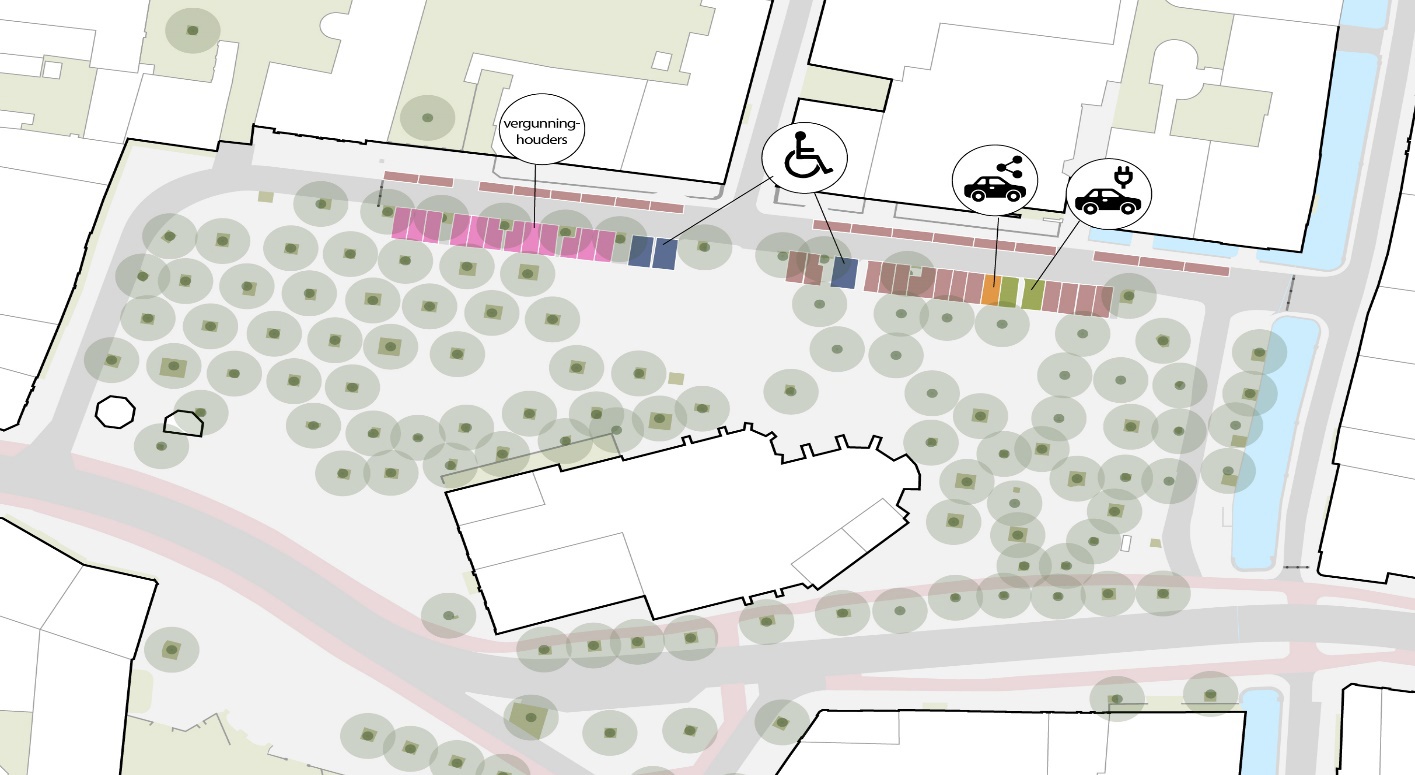 Op onderstaande tekeningen is de situatie voor en na het opheffen van de parkeerplaatsen in 2025 weergegeven. Op de eerste afbeelding staan de parkeerplaatsen die eind 2025 opgeheven zijn. Op de tweede afbeelding staat de situatie na opheffen. Zoals te zien, is door het opheffen van de parkeerplaatsen, geen rijweg op Janskerkhof meer in gebruik. Het pleingedeelte is afgesloten met een klappaal.