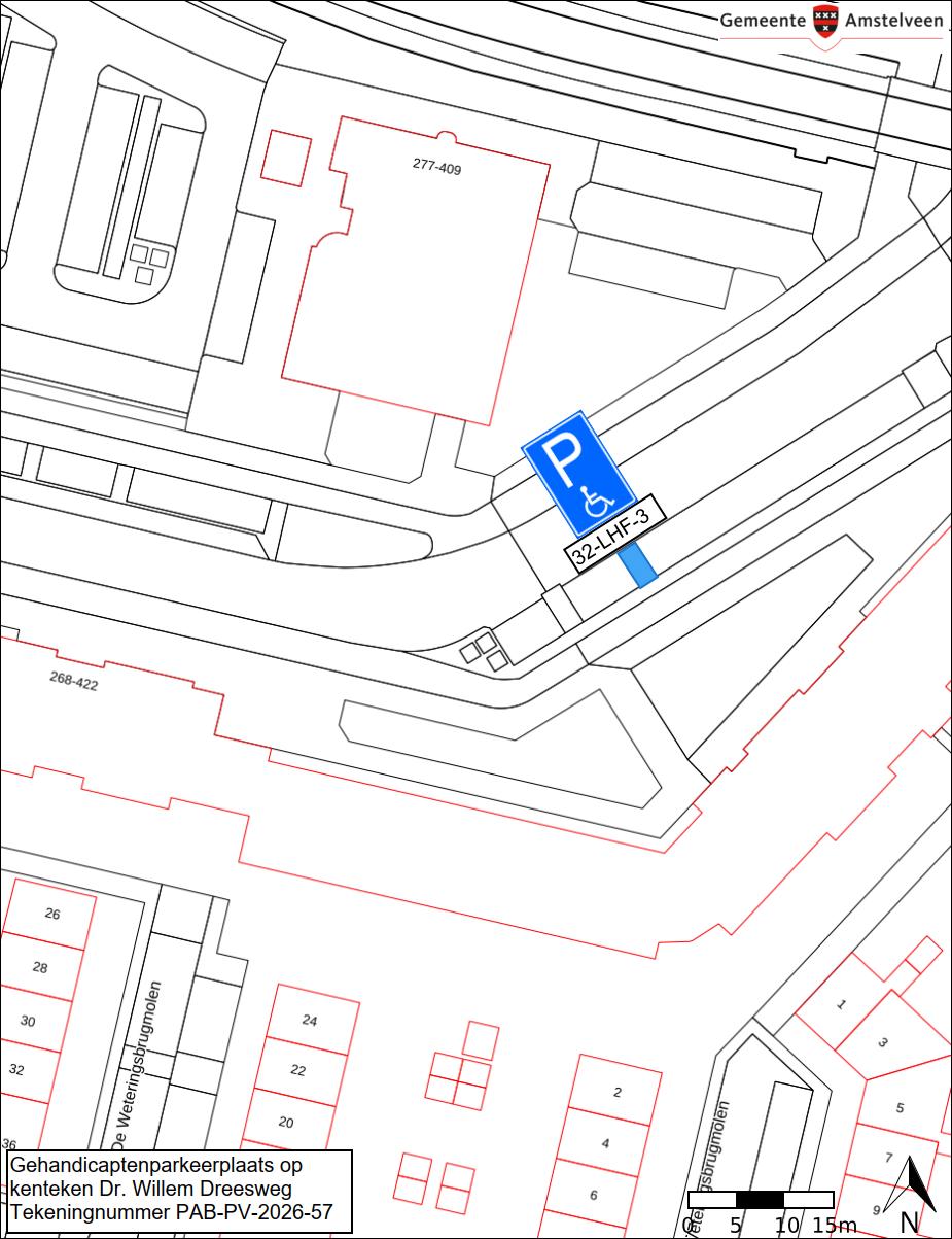 Burgemeester en wethouders van Amstelveen besluiten het parkeren te verbieden op een parkeerplaats in de Dr. Willem Dreesweg, zoals aangegeven op tekening PAB-PV-2026-57, met uitzondering van het voertuig met het kenteken 32-LHF-3 (gehandicaptenparkeerplaats).