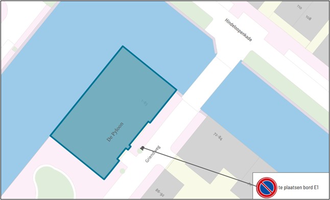Gezien voorgaande overwegingen is het gewenst dat een duidelijke aanduiding van het verbod om aldaar te parkeren wordt geplaatst. Dit wordt gerealiseerd door het haaks op de rijbaan plaatsen van bord E1 van bijlage 1 van het RVV 1990 tegenover de poort van het gebouw Griendweg 2-100. Daarmee wordt een parkeerverbod ingesteld op de noordwestelijke zijde van de Griendweg tussen het gebouw De Pyloon en de Hindeloopenkade. Gezien de aanduiding als eenrichtingsweg wordt volstaan met uitsluitend het plaatsen van het bord E1 ter hoogte van het gebouw De Pyloon.