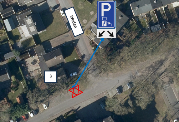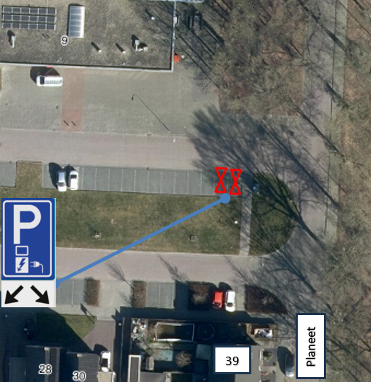 Door plaatsing van het verkeersbord model E8c met het onderbord OB504, reserveren we twee parkeervakken voor het opladen van elektrische voertuigen nabij de volgende adressen: