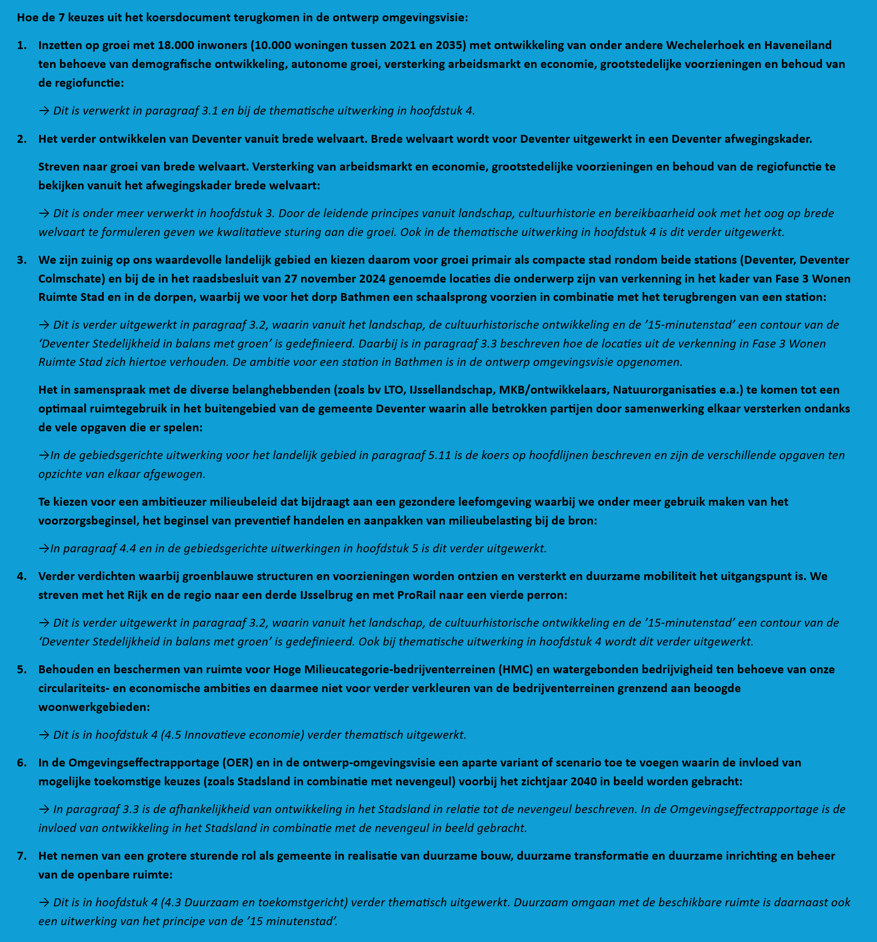 Tegelijkertijd wordt het omgevingseffectrapport aangevuld. De Commissie adviseert om in deze volgende fase aandacht te besteden aan de verschillen binnen de gemeente en vooruit te kijken naar de periode ná de omgevingsvisie. Dan is straks duidelijk welke keuzes in welk deel van Deventer gemaakt gaan worden en wat dat voor de leefomgeving betekent. Geadviseerd wordt daarvoor aan te sluiten op het ‘DNA van Deventer’, waarin het unieke karakter van de stad Deventer, de dorpen eromheen en het landelijk gebied in beeld is gebracht. Tot slot is het advies om te beschrijven hoe de gemeente de uitvoering van de visie op gaat pakken. Dan wordt duidelijk welke keuzes later uitgewerkt gaan worden en op hoe de gemeente dat wil gaan doen.