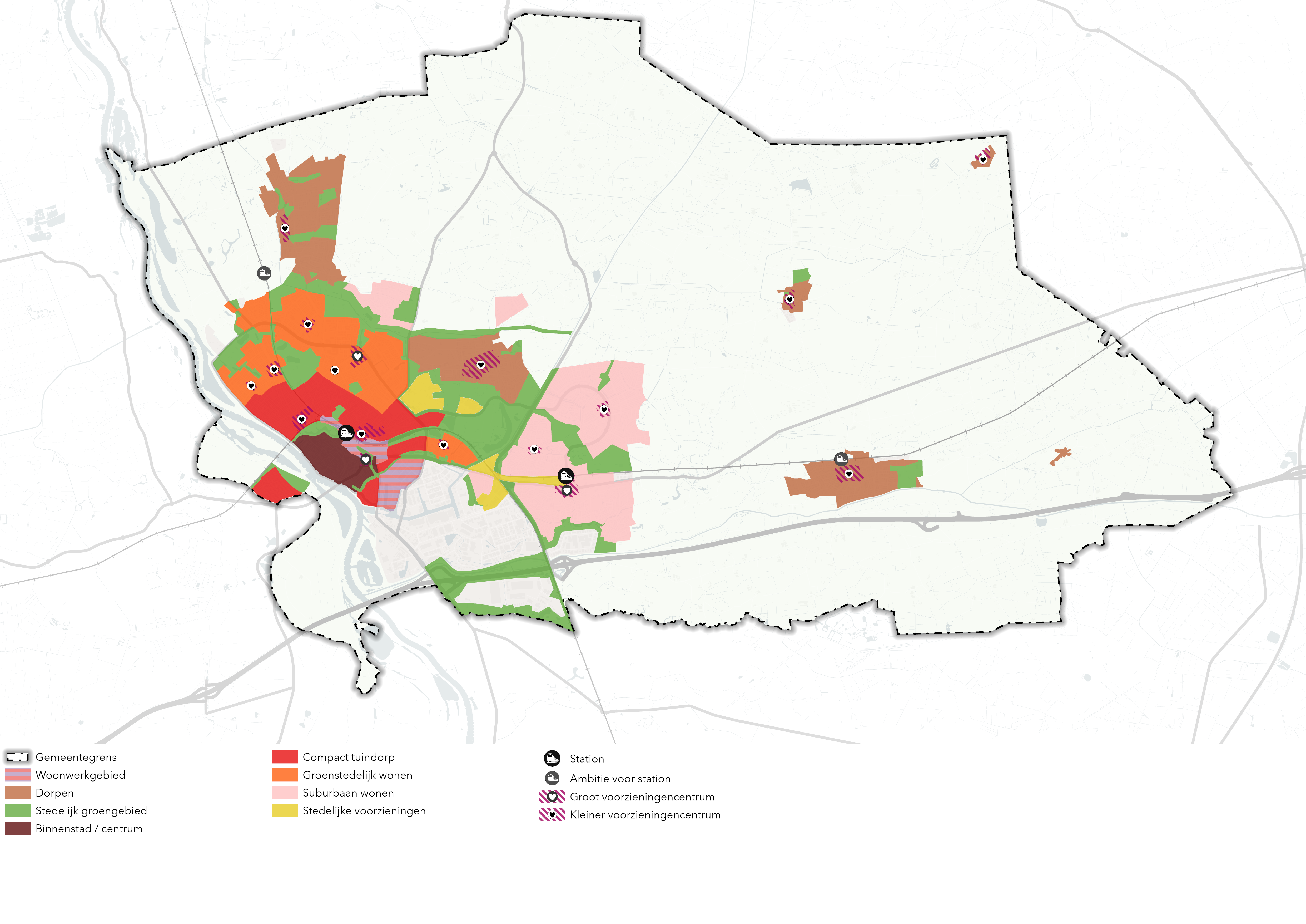 Qua verstedelijkingsambitie (woningbouw, werkgelegenheid, voorzieningen en mobiliteit) geven partners en inwoners een breed beeld van aandachtspunten mee bij zowel beperkte als juist grootschalige verstedelijking. De OER geeft aan dat een grotere mate van verstedelijking (ook bij meer overheidssturing) meer negatieve effecten met zich meebrengt dan een beperkte mate van verstedelijking. In dit koersdocument borduren we daarnaast voort op de verkenningen van woningbouwlocaties volgend uit de bestaande verstedelijkingsambitie van 11.000 woningen (traject Wonen, Ruimte, Stad). Daaruit blijkt dat realisatie van circa 10.000 woningen tot 2035 onder de huidige omstandigheden haalbaar lijkt. We verkennen daarnaast mogelijkheden voor meer groei (ten behoeve van versterken arbeidsmarkt en demografische balans) mits kan worden voldaan aan de randvoorwaarden van brede welvaart. Randvoorwaarden voor meer groei worden in de thematische uitwerkingen hieronder weergegeven en betreffen bijvoorbeeld mobiliteit en investeringen in leefbaarheid.