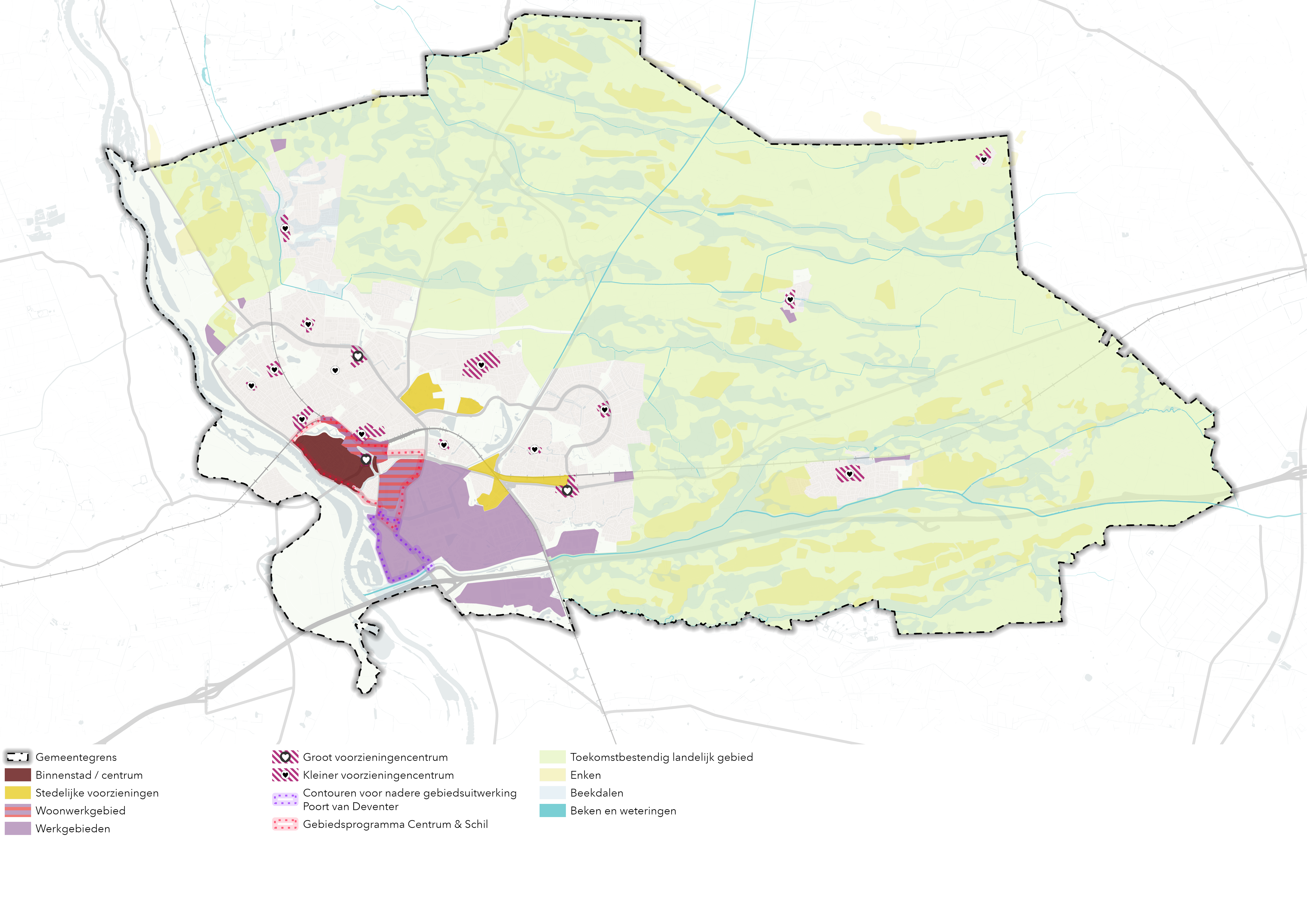In Deventer liggen belangrijke plekken voor zorg, (binnen)sport, recreatie, grote speciale winkels en scholen. We vernieuwen deze plekken en maken ze groener. Er wordt niet gewoond. De focus ligt op goede voorzieningen en een prettige omgeving.