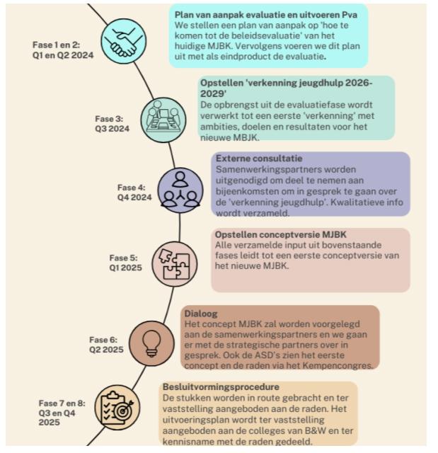 Middels een akkoord op het procesvoorstel ‘hoe te komen tot het nieuwe MeerJaren BeleidsKader’ (MJBK) en het benoemen van de stuurgroep ‘Kempisch beleidspoho Sociaal Domein’ in de vier colleges van B&W, is het proces in het eerste kwartaal van het jaar 2024 van start gegaan. Na het uitvoeren van de evaluatie van het vorige MJBK en het opstellen van de ‘verkenning’ is er input opgehaald bij diverse betrokkenen: jeugdigen1, Jeugdgezondheidszorg, ouders, Adviesraden Sociaal Domein, samenwerkingspartners zoals zorgaanbieders, scholen, de welzijnsorganisaties, kinderopvangorganisaties en raads- en commissieleden tijdens het Kempencongres in maart 2025. Op basis van al deze input is het MJBK tot stand gekomen en is een bijbehorend jaarlijks uitvoeringsplan opgesteld in samenwerking met onze strategisch partners. Tevens is er een globale 4-jaren uitvoeringsagenda opgesteld en toegevoegd aan dit MJBK. Eind 2025 wordt het uitvoeringsplan 2026 ter vaststelling voorgelegd aan de stuurgroep: het Kempisch Beleidspoho Sociaal Domein. In de afbeelding hieronder ziet u hoe dit proces er in grote lijnen uit heeft gezien.