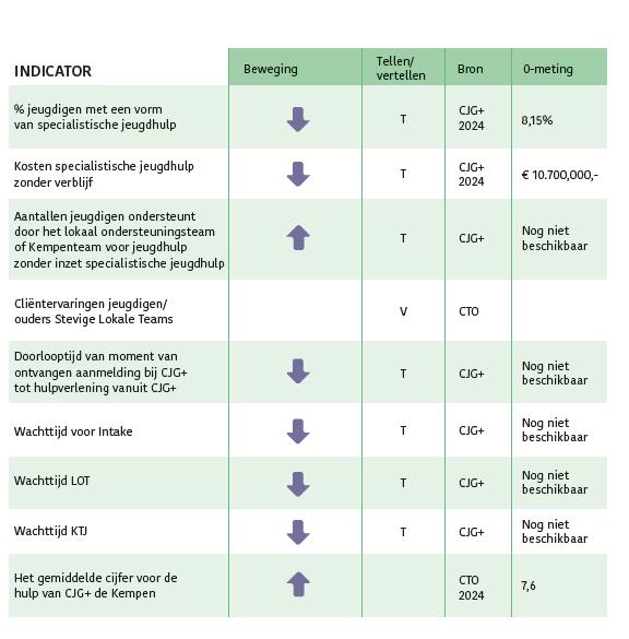 De evaluatie is gebaseerd op indicatoren uit diverse bronnen. De beschikbaarheid hangt af van de meetfrequentie van uitvoerende partijen, zoals de GGD. Indicatoren van het CJG+ zijn ofwel direct beschikbaar of zijn in ontwikkeling. Daardoor is het (nog) niet mogelijk gebleken om bij alle indicatoren een 0-meting te formuleren. Omdat het gaat om een kempisch beleidskader zijn de data weergegeven op Kempenniveau.