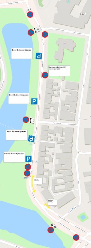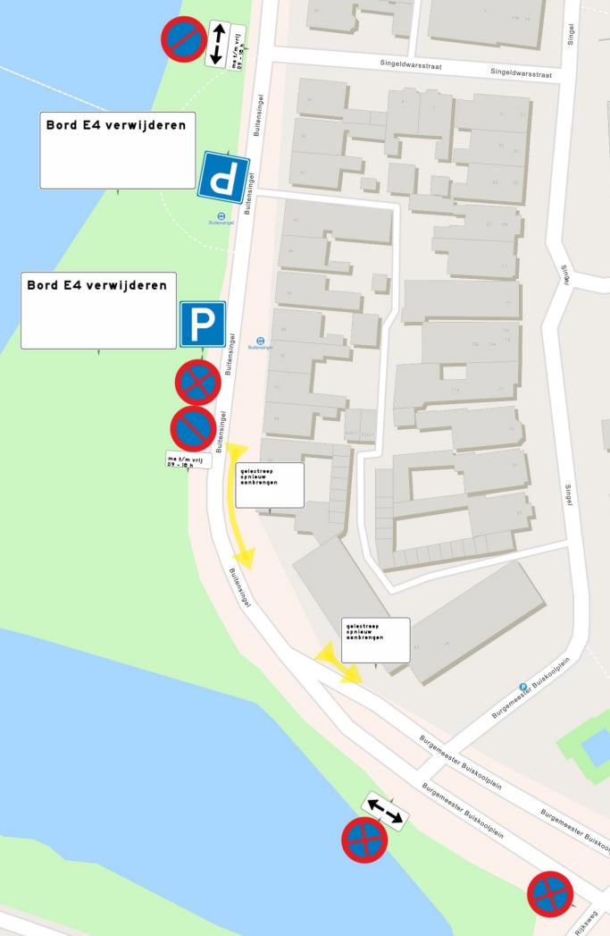 Het instellen van een parkeerverbod op de Buitensingel, vanaf de kruising met de Commandeurstraat tot aan het laatste parkeervak van de westelijke zijde van de Buitensingel (ter hoogte van nummer 54), door middel van het plaatsen van de borden E1 ‘parkeerverbod’ van bijlage 1 van het RVV1990 met onderbord ‘Ma t/m vr 09 - 18h’ en op de kruisingen met de Commandeurstraat en Singeldwarsstraat daarnaast ook het onderbord met daarop twee peilen wijzend naar links en rechts om aan te geven dat de borden in beide richtingen gelden.