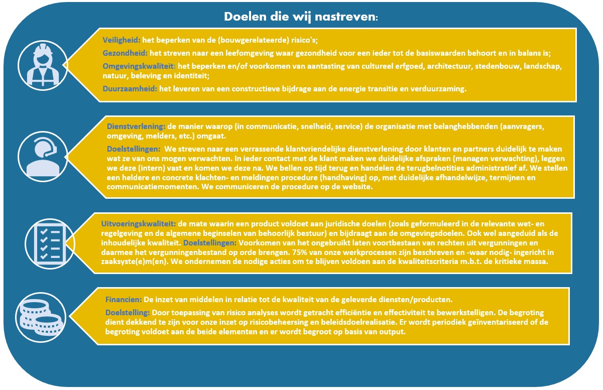Cruciaal voor het leveren van kwaliteitsproducten is de beschikbaarheid van vakmanschap en expertise en de borging van de kwaliteit. Als kwaliteitsafspraken niet worden vastgelegd, gemonitord en gerapporteerd is er een sterke mate van afhankelijkheid van de individuele medewerker. Kwaliteit is (1) het realiseren van de afgesproken doelstellingen en (2) het voldoen aan de wettelijke eisen. In de verordening Uitvoering en handhaving Omgevingsrecht gemeente Heeze-Leende is een verplichting opgenomen om doelen uit te werken op de volgende onderwerpen. Zie figuur 5, de tabel hieronder: