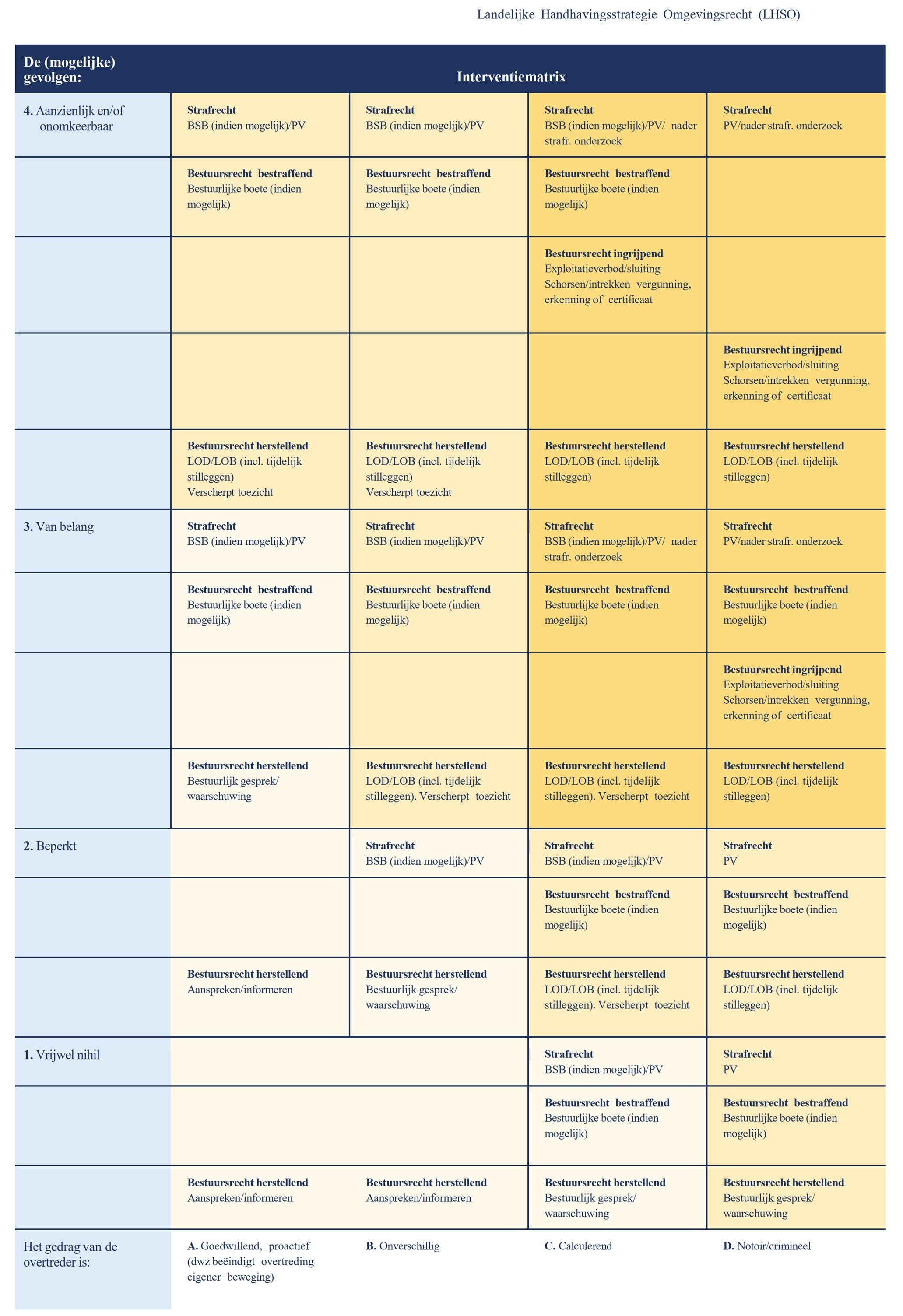 De LHSO geeft een stappenplan om te komen tot een passend optreden. Startpunt van het stappenplan zijn de bevindingen van het toezicht: de constatering van feiten en omstandigheden en het oordeel van de toezichthouder, boa of handhaver daarover (de vaststelling dat sprake is van een overtreding). Aan de hand van het stappenplan, waartoe de hierna weer te geven interventiematrix behoort, kan worden gekomen tot onderling afgestemd en effectief handelen van de handhavingspartners.