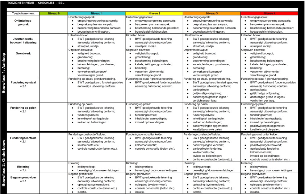 In bijlage 7 is de toezichtmatrix opgenomen. Per toezichtmoment bepalen wij de diepgang van het toezicht door de aldaar genoemde paragra(a)f(en) op te zoeken bij de juiste functie in de toetsmatrix. De toezichtsniveaus kennen net als de toetsniveaus een schaalverdeling van 1 tot en met 4, waarbij niveau 1 staat voor minimaal toezicht en 4 voor het maximaal toezicht. Wij werken de toezichtmatrixen uit in (digitale) checklists, die wij als hulpmiddel bij het toezicht van omgevingsvergunningen op het Bbl hanteren.