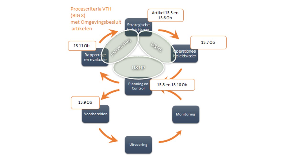 Onder de Omgevingswet is sprake van een tweede beleidscyclus (zie figuur 3). Deze kent een vergelijkbare opzet (Plan, Do, Check, Act). Het verschil zit in het feit dat die cyclus betrekking heeft op de doelen ten aanzien van de fysieke leefomgeving, zoals per gemeente vervat in een Omgevingsvisie, Omgevingsprogramma en in de regelgeving uitgewerkt in het Omgevingsplan en Omgevingsvergunning. Het is veel meer omvattender. VTH taken zijn in die cyclus te definiëren als één van de mogelijk in te zetten instrumenten.