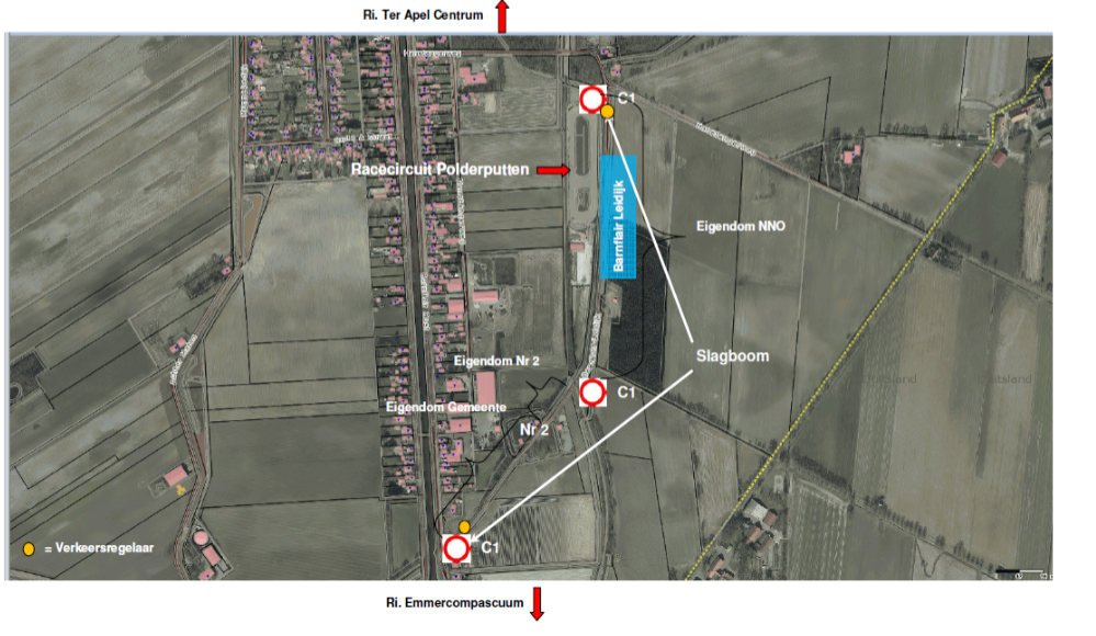 De Barnflair Leidijk tussen de Hanetangerweg en de Barnflair Oost in Ter Apel i.v.m. het houden van ‘Ovalracingwedstrijden’ op racecircuit ‘De Polderputten’ middels het plaatsen van borden C1 van bijlage 1 van het RVV 1990 en het neerlaten van 2 ter plaatse aanwezige slagbomen in beide richtingen gesloten te verklaren voor voertuigen, ruiters en geleiders van rij- of trekdieren of vee op de volgende data en tijden: