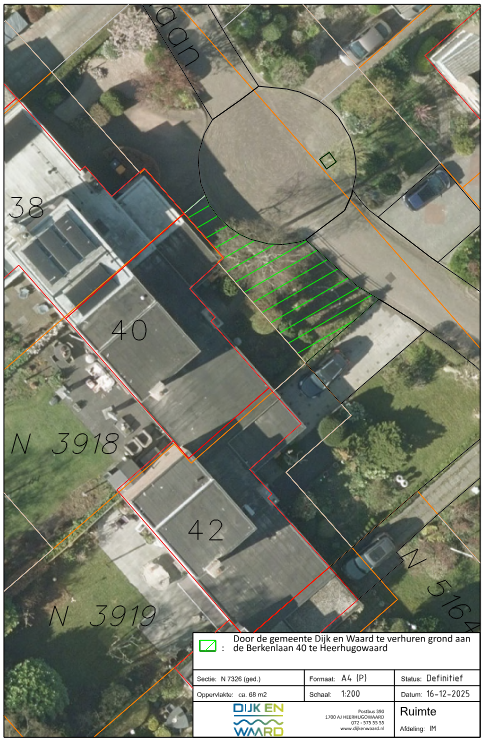 De gemeente Dijk en Waard is voor een tuinuitbreiding van plan om snippergroen kadastraal bekend als Heerhugowaard, sectie N, nummer 7326 (gedeeltelijk) ter grootte van ca. 68 vierkante meter te verhuren aan de eigenaar van de aangrenzende woning aan de Berkenlaan 40.