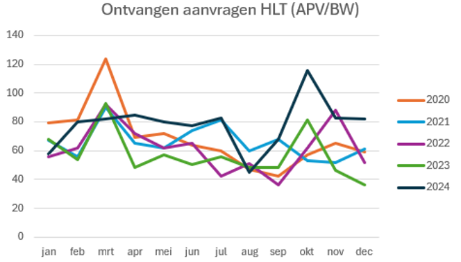Opvallend is dat er in 2024 gemiddeld meer aanvragen en meldingen zijn gedaan dan de jaren daarvoor. Het betreft hier met name de aanvragen voor gebruik openbare grond en aanverwante zaken. Daarnaast is er veel tijd besteed aan voorlichting.