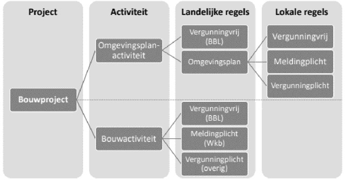 Als gevolg van de Wkb zal de huidige omgevingsvergunning voor het bouwen in twee activiteiten worden opgesplitst, een bouwactiviteit en een omgevingsplanactiviteit. Zie het schema.