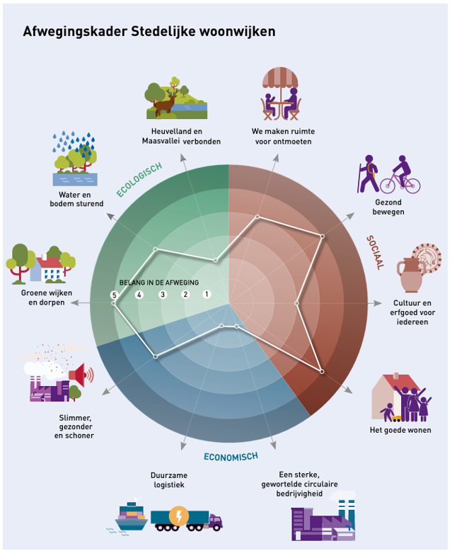 Voorbeeld: Stedelijke woonwijken. In dit afwegingskader krijgen ambities als het goede wonen, gezond bewegen en groene wijken en dorpen een hoge score (4 of 5). Ambities die meer samenhangen met economische functies, zoals duurzame logistiek of circulaire bedrijvigheid, scoren hier lager.