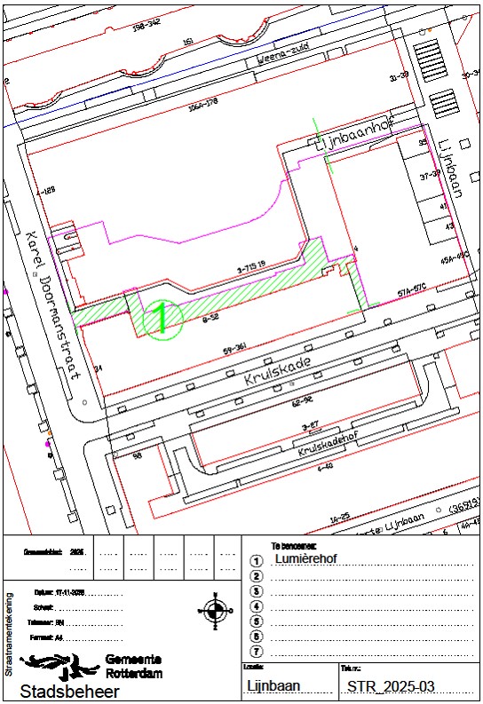 In deze nieuwe gebiedsontwikkeling aan de Lijnbaan wordt de Lijnbaanhof in tweeën geknipt. Het begin van de Lijnbaanhof is in de nieuwe situatie dus niet meer met het eind verbonden. Daarom wordt geadviseerd de verbinding aangegeven met het cijfer 1 in de bijlage van een nieuwe naam te voorzien.