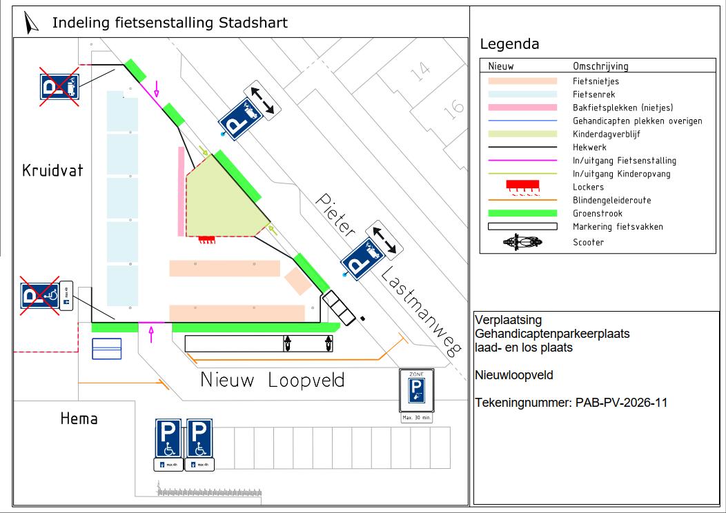 Ter plaatse van de straat Nieuwloopveld tegenover huisnummer 13 worden één gehandicaptenparkeerplaats en één laad- en losplaats verplaatst. De huidige situering komt te vervallen om ruimte te creëren voor de aanleg van een overdekte fietsenstalling.