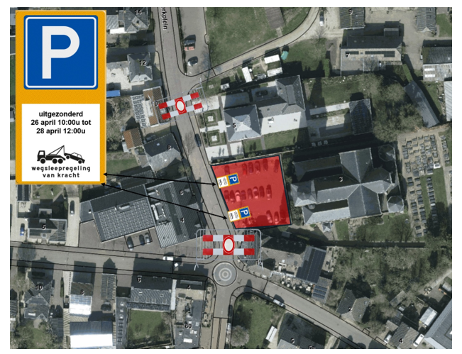 Het instellen van een parkeerverbod op de parkeerplaatsen aan de Kerkplein te Beugen middels bebording te plaatsen van bijlage 1 van het Reglement Verkeersregels en Verkeerstekens 1990 volgens model E4, met de uitzondering voor 26 april 2026 10:00 uur tot en met 28 april 2026 12:00 uur.