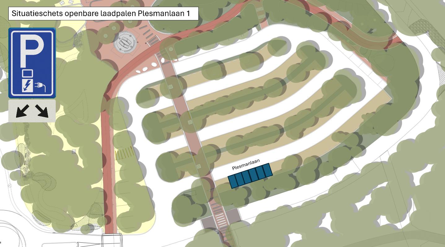 1. Door middel van het driemaal plaatsen van het verkeersbord E8c van bijlage 1 van het RVV 1990 met een onderbord met pijlen, waaruit blijkt dat het bord voor twee parkeerplaatsen van toepassing is op de Plesmanlaan ter hoogte van huisnummer 1, driemaal een tweetal parkeerplaatsen te reserveren ten behoeve van het opladen van elektrische voertuigen.