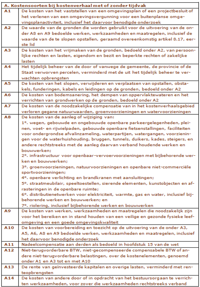 Kostenverhaal is verplicht voor zaken van deze kostensoortenlijst. De kosten worden verhaald op degenen die (ver)bouwmogelijkheden krijgen en realiseren. Die plicht geldt bij bepaalde planologische besluiten.