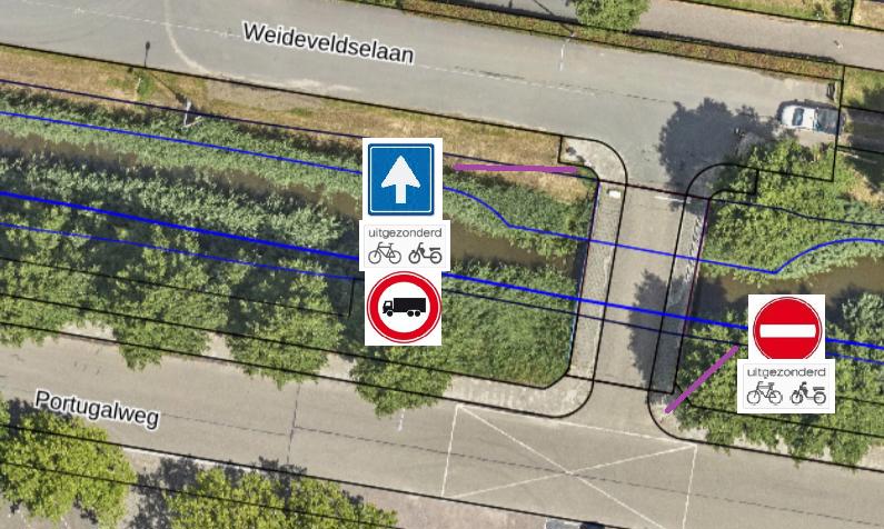 is het gewenst om de slagboom op de doorgang van de Weideveldselaan en de Portugalweg te verwijderen en de weg open te stellen voor verkeer met uitzondering van vrachtverkeer. Deze maatregel wordt voorzien van het verkeersbord C7 van bijlage I van het Regelement Verkeersregels en Verkeerstekens 1990.