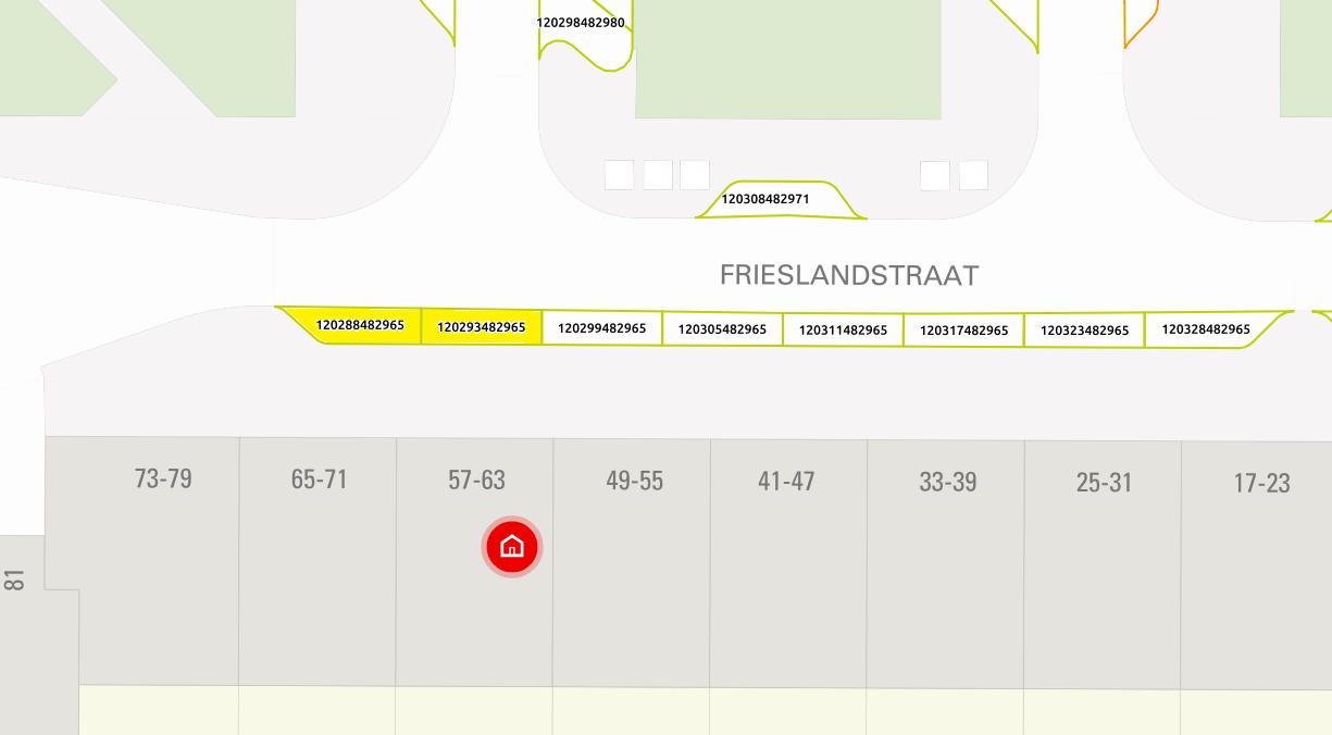 Twee parkeerplaatsen ter hoogte van perceel Frieslandstraat 61 (parkeervaknummers 120288482965 en 120293482965) aan te wijzen voor het opladen van elektrische voertuigen door het plaatsen van een bord conform model E8c van Bijlage I van het RVV 1990, gecombineerd met onderbord OB504 met daarop afgebeeld twee pijlen op een hoek van 45° (RVV 1990).