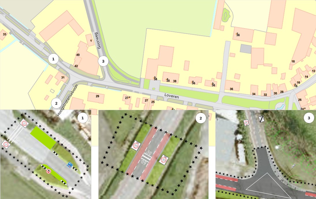 Loveren (tussen de bebouwde komgrens en Akkerstraat), de Hoogstratensebaan (tussen bebouwde komgrens en Loveren) en de zuidelijke 60 meter van de Goorweg zijn in de huidige situatie wegen met een maximumsnelheid van 50km/uur.
