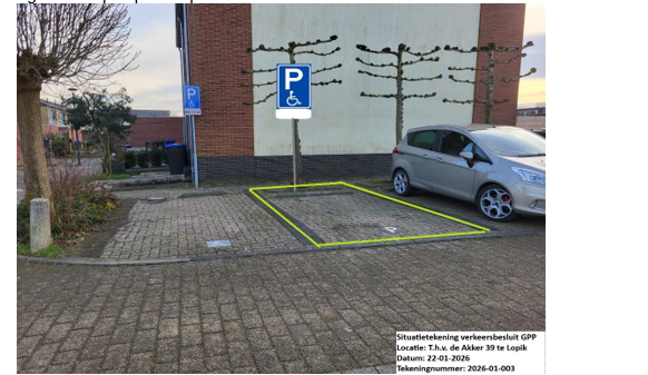 Door plaatsing van verkeersbord E06 (gehandicaptenparkeerplaats) en onderbord OB309 73-XR-FP van Bijlage I van het Reglement Verkeersregels en Verkeerstekens 1990, zoals is aangegeven op de bij dit verkeersbesluit behorende en gewaarmerkte tekening met kenmerk 2026-01-003, een parkeerplaats in de nabije omgeving van Akker 39, te Lopik aan te wijzen als gereserveerde gehandicaptenparkeerplaats.
