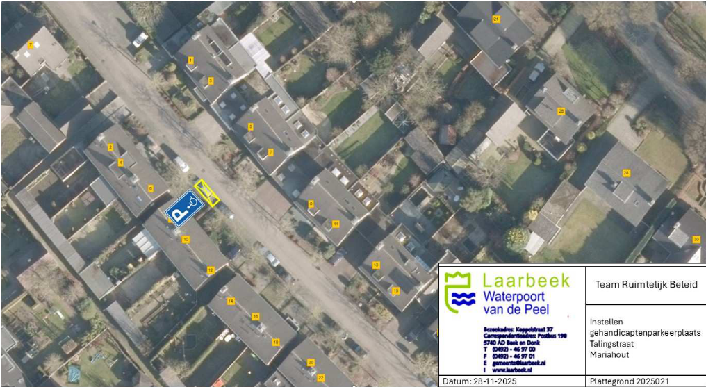 dat op 24 november 2025 door een bewoner uit de Talingstraat een verzoek is gedaan voor het instellen van een gehandicaptenparkeerplaats op kenteken aan de Talingstraat in Mariahout;