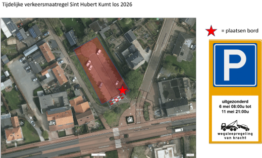 Het instellen van een parkeerverbod op de parkeerplaatsen aan het Nel Neulplein te Sint Hubert middels bebording te plaatsen van bijlage 1 van het Reglement Verkeersregels en Verkeerstekens 1990 volgens model E4, met de uitzondering voor 6 mei 2026 08:00 uur tot en met 11 mei 2026 21:00 uur.